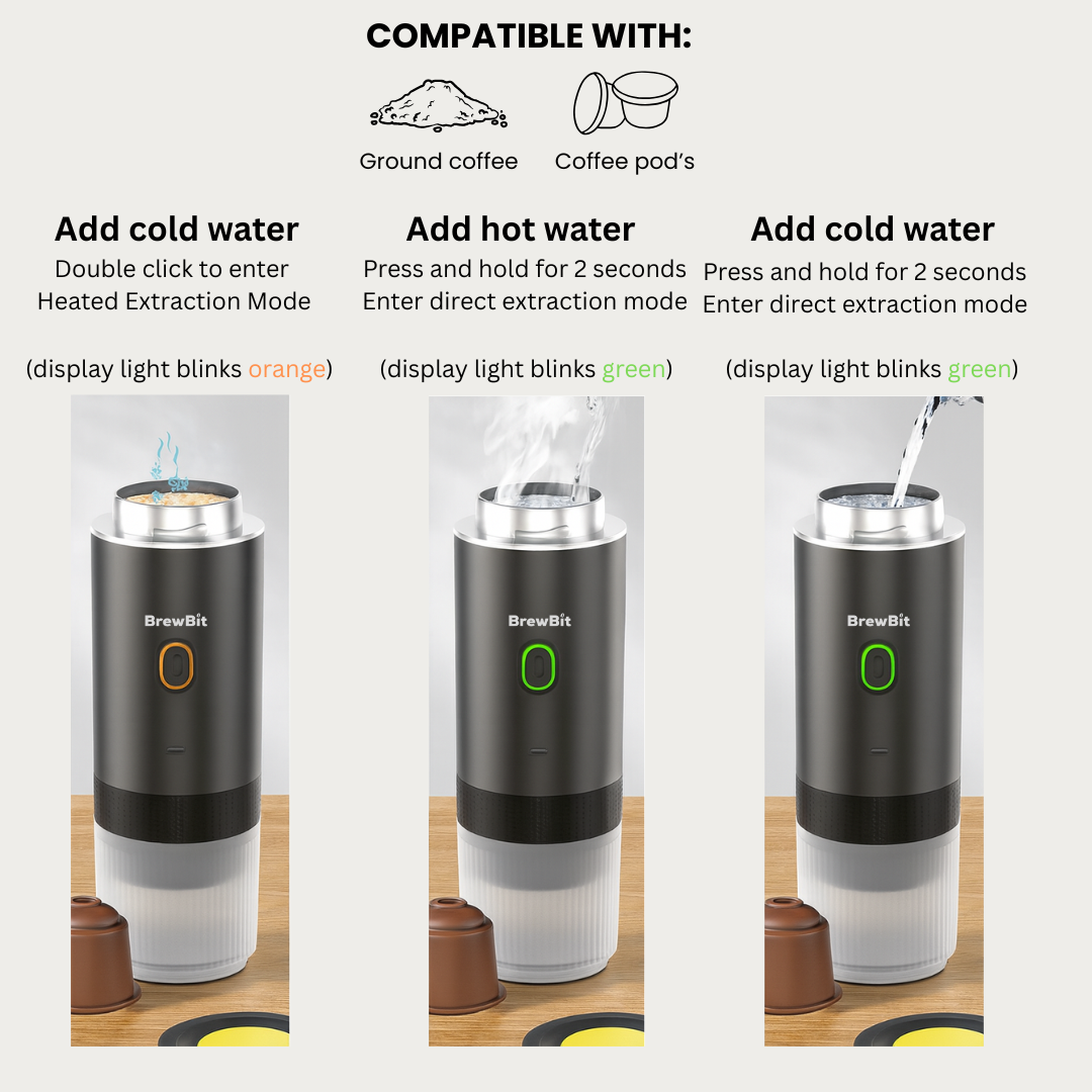 BrewBit 3-in-1 Portable Espresso Machine offers unmatched versatility, convenience, and quality in one sleek device. Unlike many competitors, BrewBit is compatible with ground coffee, small pods, and large pods, giving users total brewing freedom. Its powerful rechargeable battery can brew up to 10 cups on a single charge, with no need to plug in - perfect for travel, work, or outdoor adventures. Designed with durability, modern aesthetics, and affordability in mind, BrewBit delivers premium espresso anytime, anywhere - without compromise.